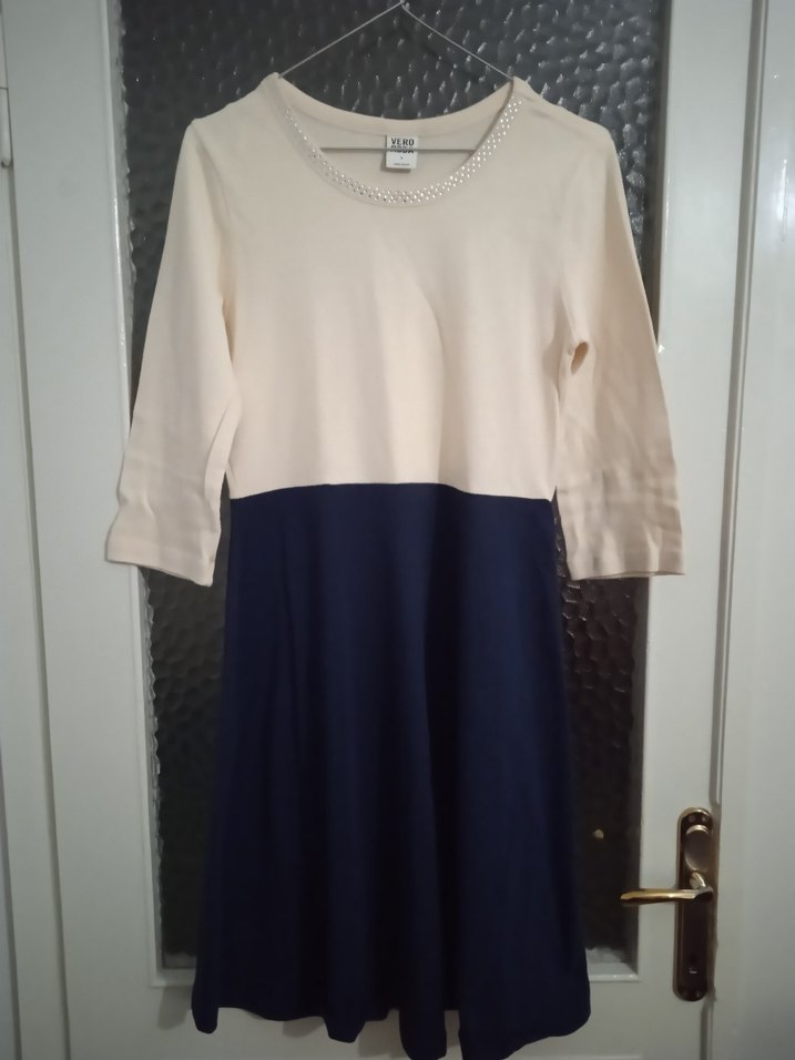 Pamuk kumaştan, uzun kollu, yuvarlak yakalı midi elbise. Beyaz üst ve lacivert alt kısmı ile sade ve şık, ofis için uygun.