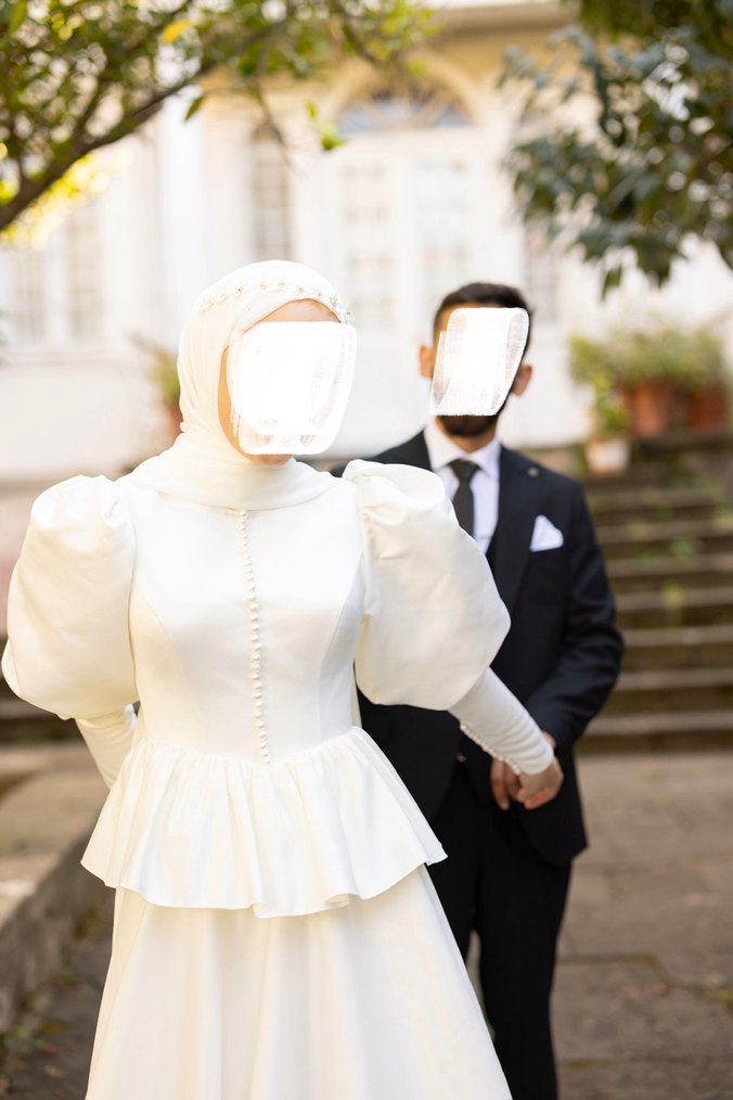 Uzun kollu, notched lapel yakalı, midi boy ve regular fit beyaz söz/nişan elbisesi. Mütevazı ve avangard detaylara sahip, bel kısmında peplum detayı bulunur.