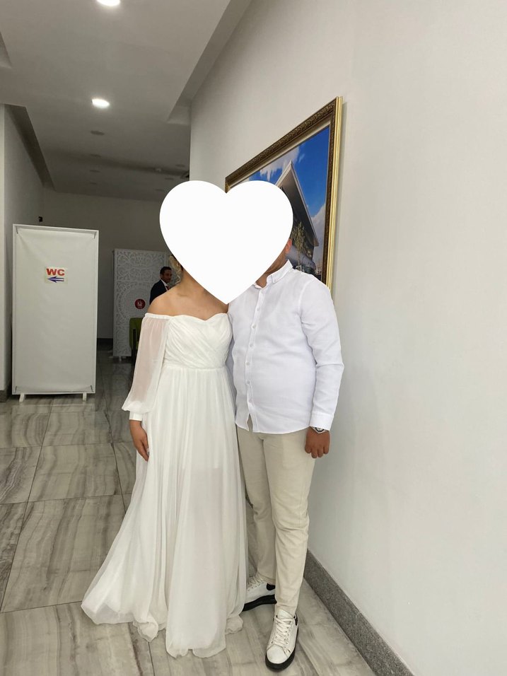 Beyaz nikah elbisesi straplez yaka, uzun kollu ve midi boyda A-line kesimle modern klasik ve minimalist tarz sunar.