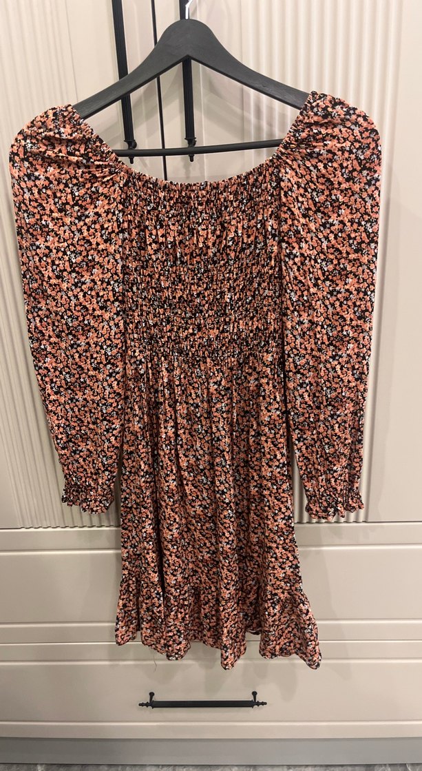 DKS midi elbise, uzun kollu ve tekne yakalıdır. Pilili, bol kesim ve koyu tie-dye desenlidir. Rahat ve sokak tarzına uygundur.