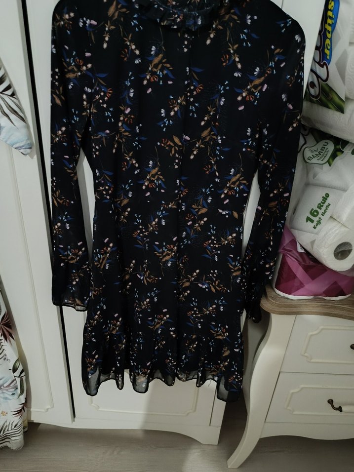 Uzun kollu, yüksek yakalı ve fırfırlı detaylara sahip, çiçek desenli mini elbise. Trendy ve günlük kullanıma uygun. trendyoldan alındı hiç giyilmedi