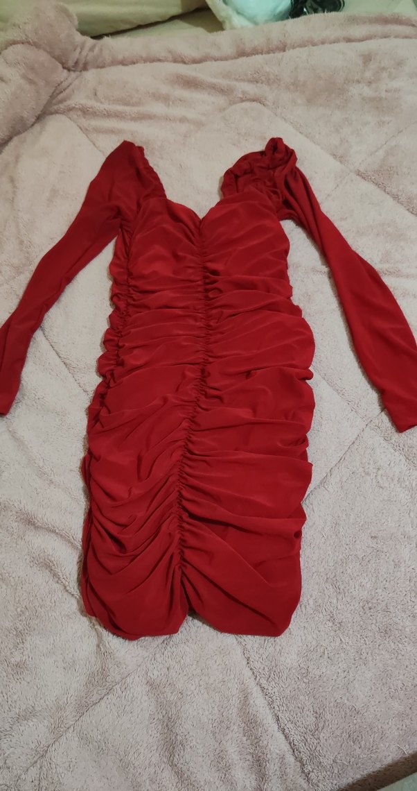 Streç kumaş vücudu sarar, bileğinde ip kaçması var, koyu kırmızı resimlerde tam renk belli olmuyor