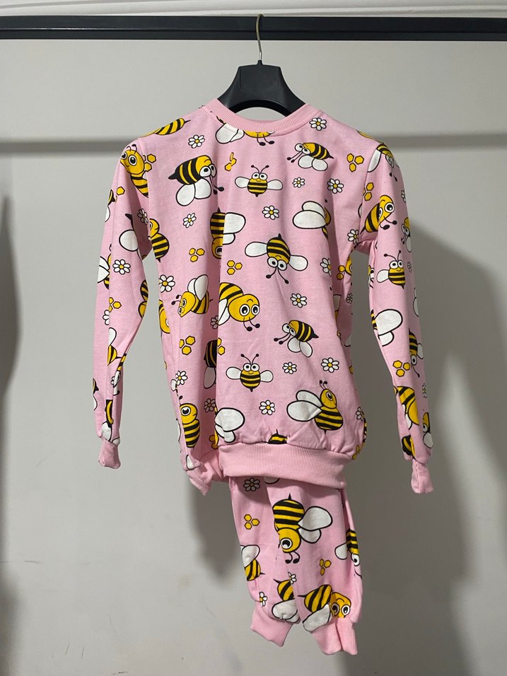 Uzun kollu, yuvarlak yaka ve renkli pembe arı baskılı, bol kesim mini hamile pijama takımı. Rahat ve şık bir tasarım.