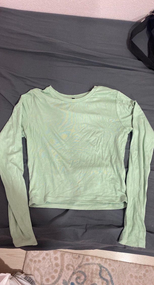 Pastel yeşil, uzun kollu, ince yapılmış, bisiklet yakalı ve fitted kesim üst. Sade ve günlük sokak stili için uygun.