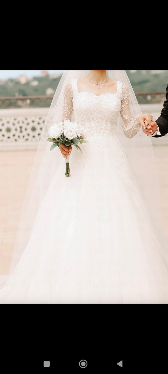 Bu uzun kollu, yakalı ve vücuda oturan A kesim gelinlik, klasik ve modern dokunuşlarla sade bir şıklık sunar. 49 kg de giyildi sorunsuz koldaki tül çıkartılıyor
