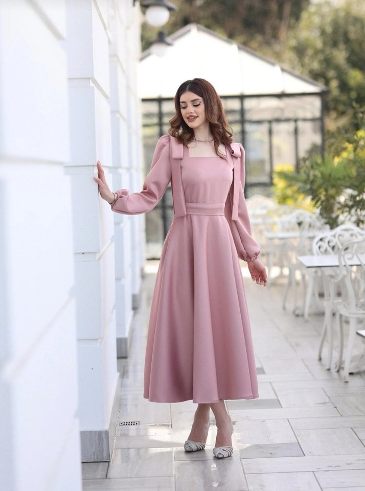 gül kurusu uzun kollu, straplez yaka ve drapeli tasarıma sahip modern klasik elbise. kalın mat Saten kumaştan, düzenli kesim ve düğün için uygun. L beden. elbise boyu 135 cm