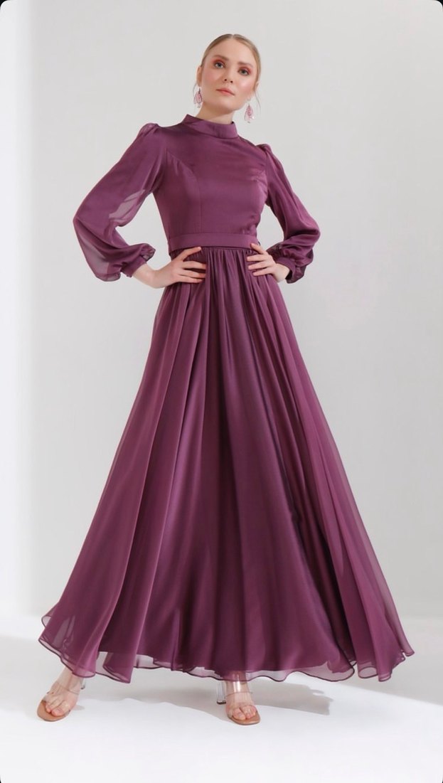 Yüksek yakalı, uzun kollu ve bol kesimli mor uzun abiye elbise. 44 beden ve herhangi bir işlem yok. Bir kere giyildi. İstenirse şal ekleyebilirim