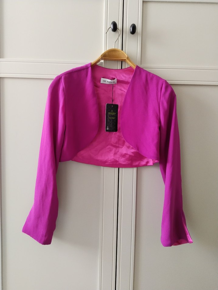Uzun kollu, düğmeli, mor renk kız bolero. İnce ve parlak saten kumaştan, dar kesim ve yuvarlak yaka ile modern tarzda.