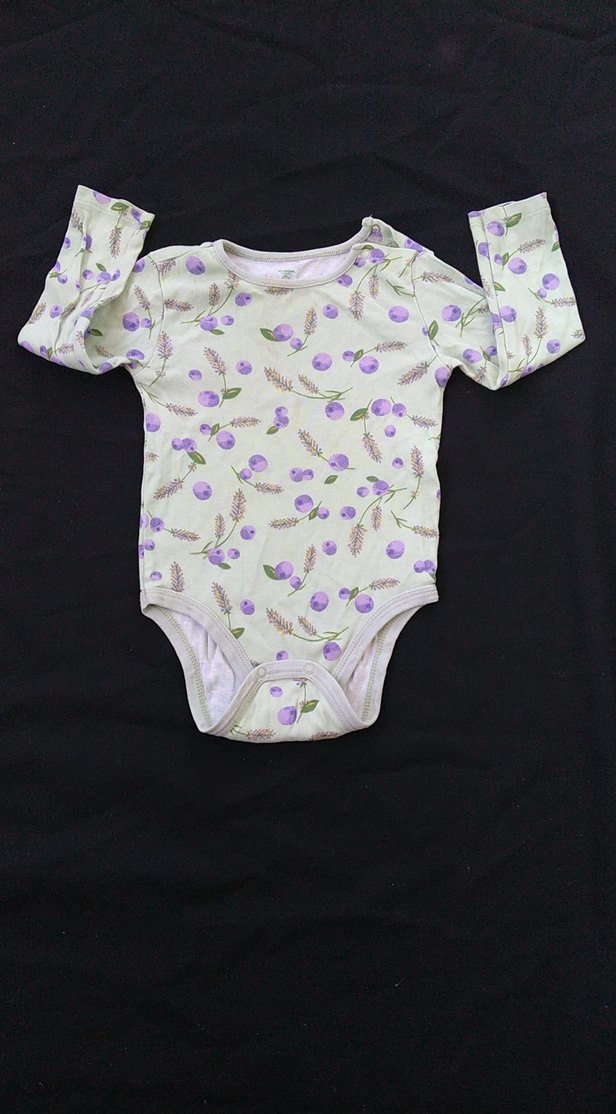 Pastel mor renkli, uzun kollu, düğmeli bebek body. Çiçek desenleriyle sade bir tasarıma sahiptir.