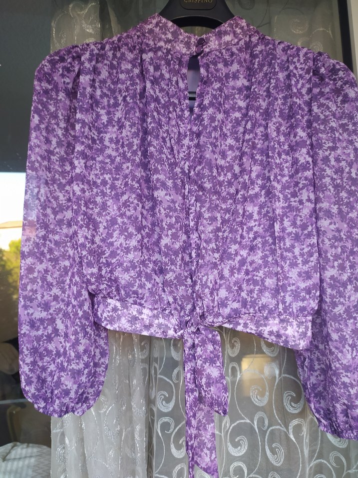 Uzun kollu, halter yakalı, parlak mor renkli, bağlamalı ve dökümlü tasarıma sahip bol kesim midi boy bluz. Bohem ve vintage tarzı yansıtıyor.