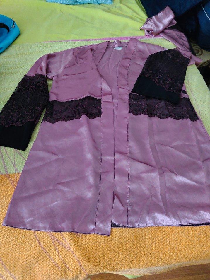 Mor renkli, uzun kollu ve bol kesim bohem tarzda kadın gecelik. Koyu dantel detaylarıyla rahat ve şık bir görünüm sunar.