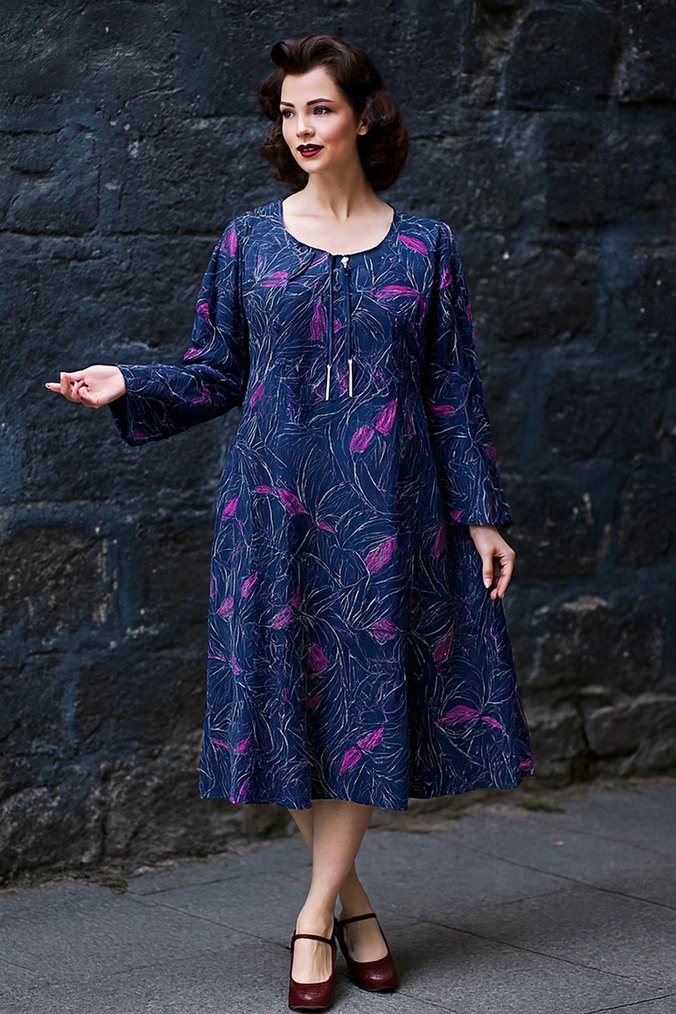 Uzun ve salaş kesimli bu elbise, ipeksi kumaş ve koyu mor desenlere sahiptir. Uzun kollu, V yaka ve püskül detaylı bohem tarzda, romantik akşamlar için uygundur.