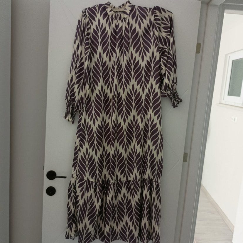 Yüksek yakalı, uzun kollu ve bol kesimli bu uzun elbise, sentetik kumaştan yapılmış olup, pliseli tasarım ve koyu mor batik desenine sahiptir.