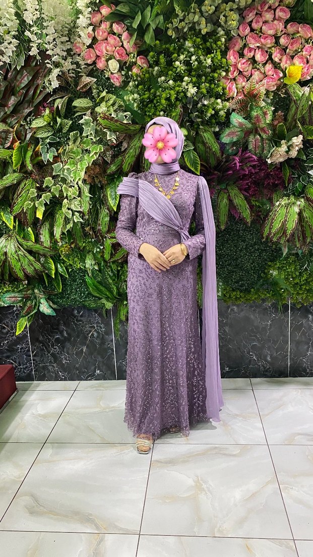 Bir defa kullanıldı. Yüksek yakalı, uzun kollu ve çiçek desenli mor, vücuda oturan bu elbise, drapeli detaylarla tesettürlü ve göz alıcı bir görünüm sunar, düğün için uygundur.