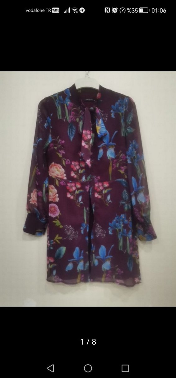 Uzun kollu, yüksek yakalı, düğmeli, koyu mor çiçek desenli bol kesim uzun tunik. Ofis için uygundur. Kolları şifon günlük giyime uygun