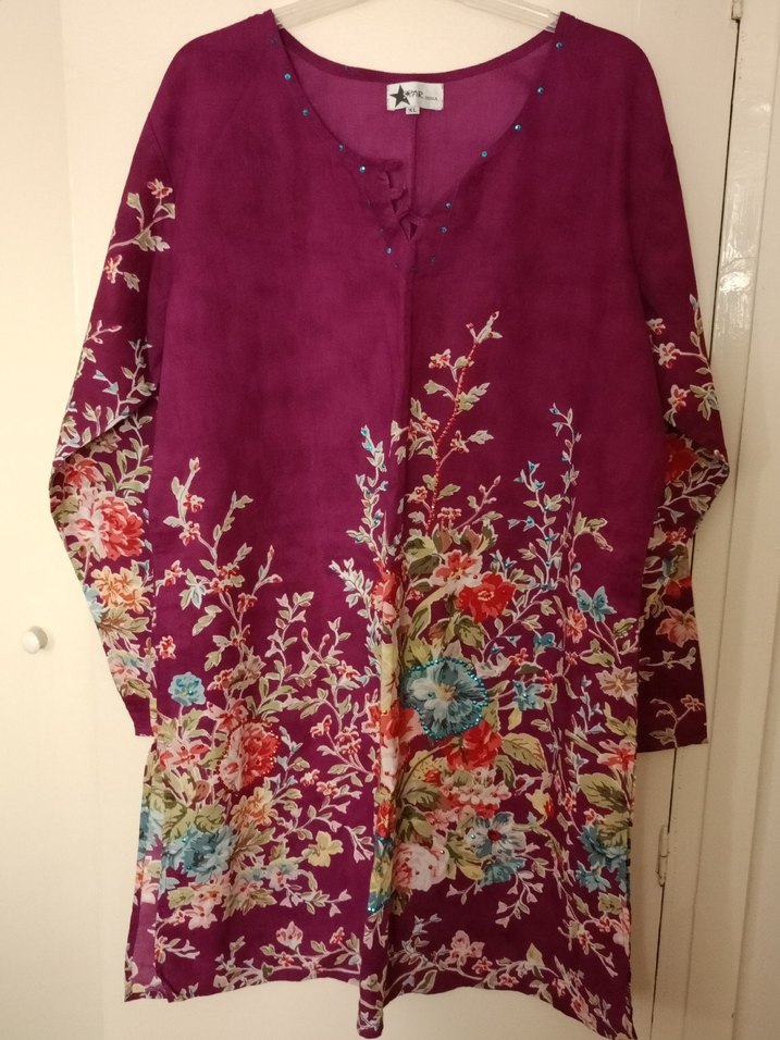 Uzun kollu, mor renkli, çiçek desenli, önü pul işlemeli, bol kesim kadın tunik. Yumuşak %100coton kumaştan, günlük kullanıma uygun. Yazın mayo üzerine de giyilebilir...