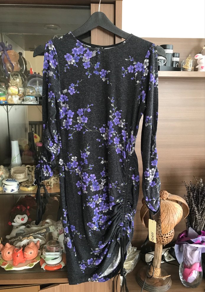 Uzun kollu, bisiklet yaka, sentetik kumaştan yapılmış, koyu mor çiçek desenli, drapeli, rahat gotik ve trend günlük stil midi elbise.kolları yırtmaçlı ön büzgülü açılabiliyor.s/m uyumlu