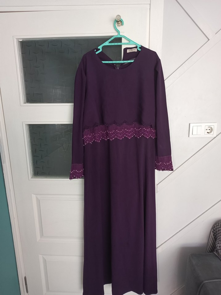 Uzun Kollu Mor Dantel Detaylı Uzun Elbise