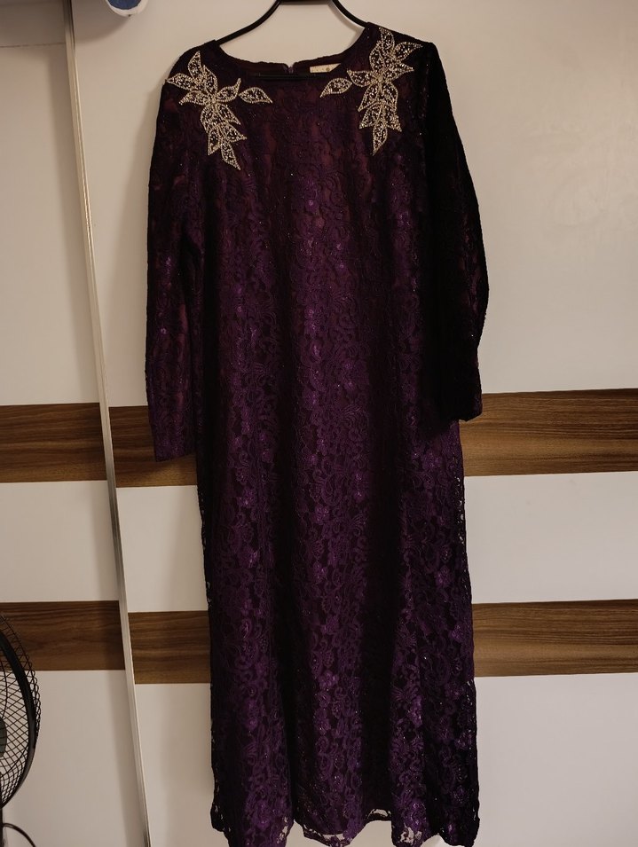Uzun Kollu Mor Dantel İşlemeli Elbise