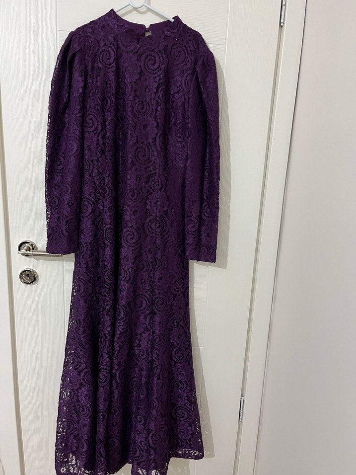 Fitted kesim, uzun mor elbise yüksek yaka ve dantel triko kumaştan üretilmiştir. Uzun kollu ve mütevazı gotik tarzda, düğün için uygundur.