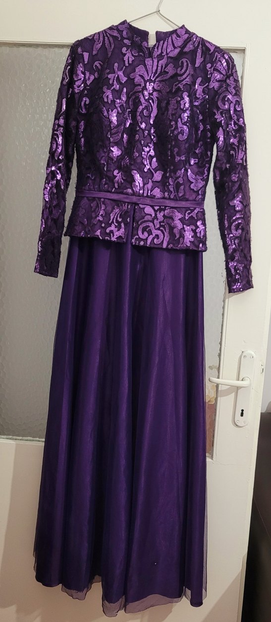 Uzun kollu, desenli ve drapeli mor abiye elbise. Notch yakalı, regular fit model, düğünler için uygundur.