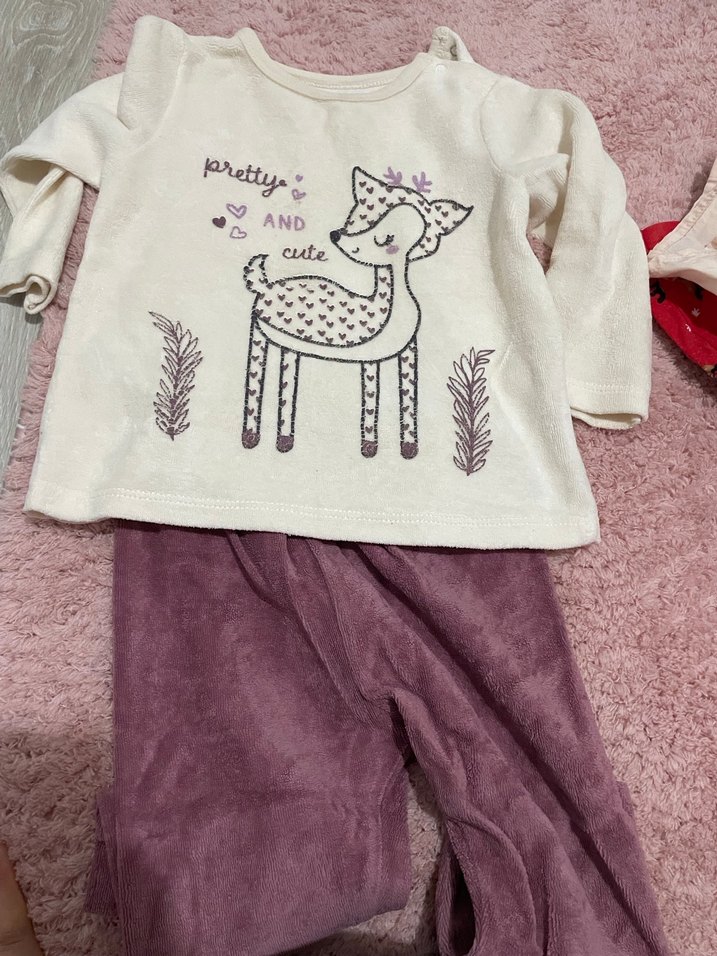 Uzun kollu, pastel mor renkte, geyik desenli ve örme detaylı bebek kız kıyafet takımı. Yumuşak kumaşı rahatlık sağlar.