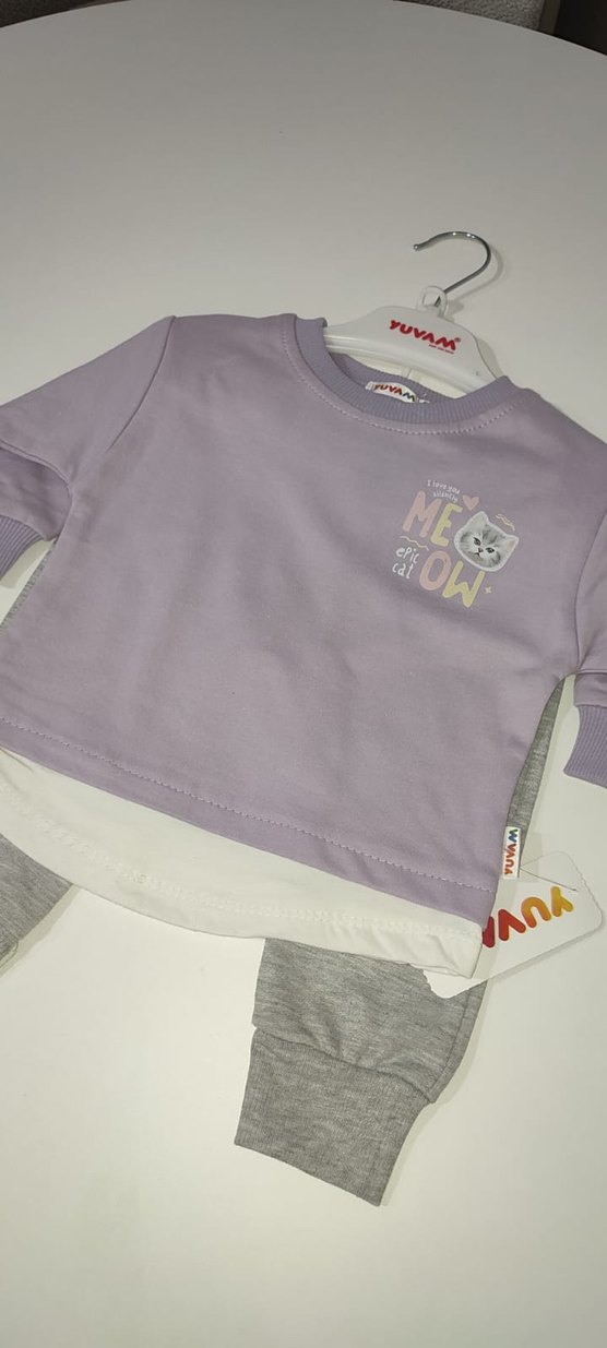 Uzun kollu mor üst, baskılı kedi deseni ve cırt cırtlı kapanışa sahip, yumuşak gri pantolonla tamamlanan kız bebek takımı.