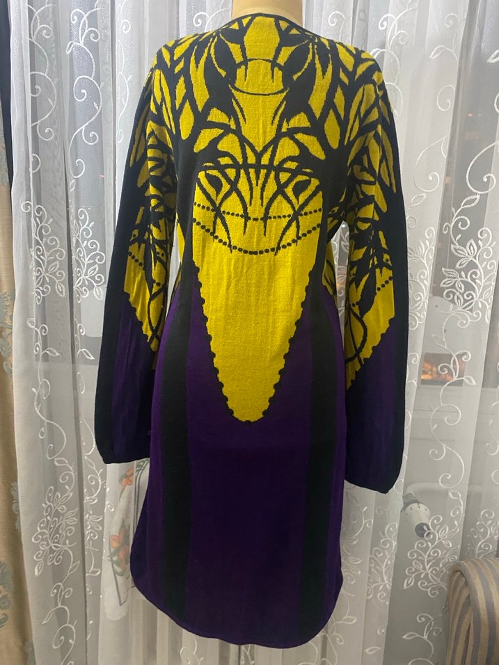 Uzun kollu, mor renkte örgü elbise, sarı desenlerle süslenmiştir. V yaka ve bol kesim ile rahat ve bohem tarz sunar. Günlük kullanım için uygundur.