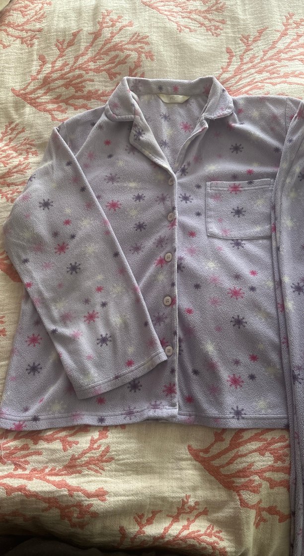 Bu bol kesim pijama üstü uzun kolludur ve düğmeli ön kısmı vardır. Yumuşak mor polar kumaş üzerine hafif yıldız desenleri bulunur, rahat geceler için uygundur.