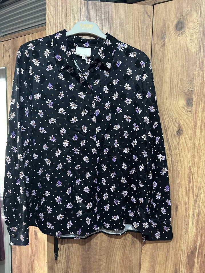 Uzun kollu, notched lapel yakalı, mor çiçek desenli koyu renk salaş gömlek. Düğmeli ve midi boyda, günlük ve sokak stiline uygun.