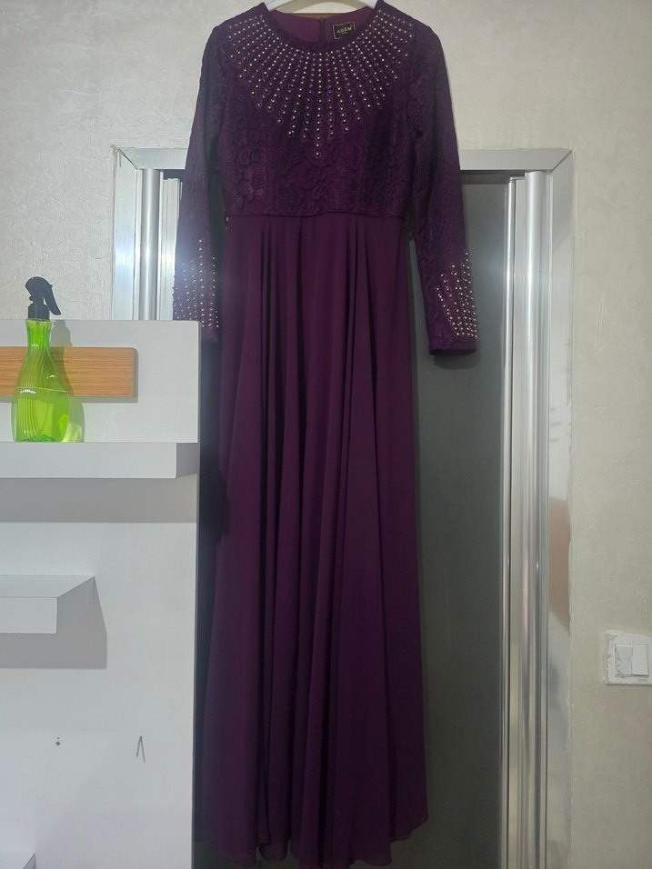 Uzun, mor renkte, drape detaylı, vücuda oturan kadın abiye elbise. Uzun kollu ve yuvarlak yakalı, düğün ve özel davetler için uygun klasik modern tarzda.