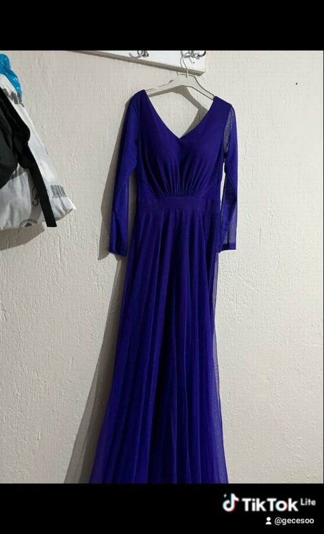 Uzun kollu, mor renkli, drapeli detaylara sahip, v yaka ve klasik modern stil abiye elbisedir. Düğünler için uygundur.