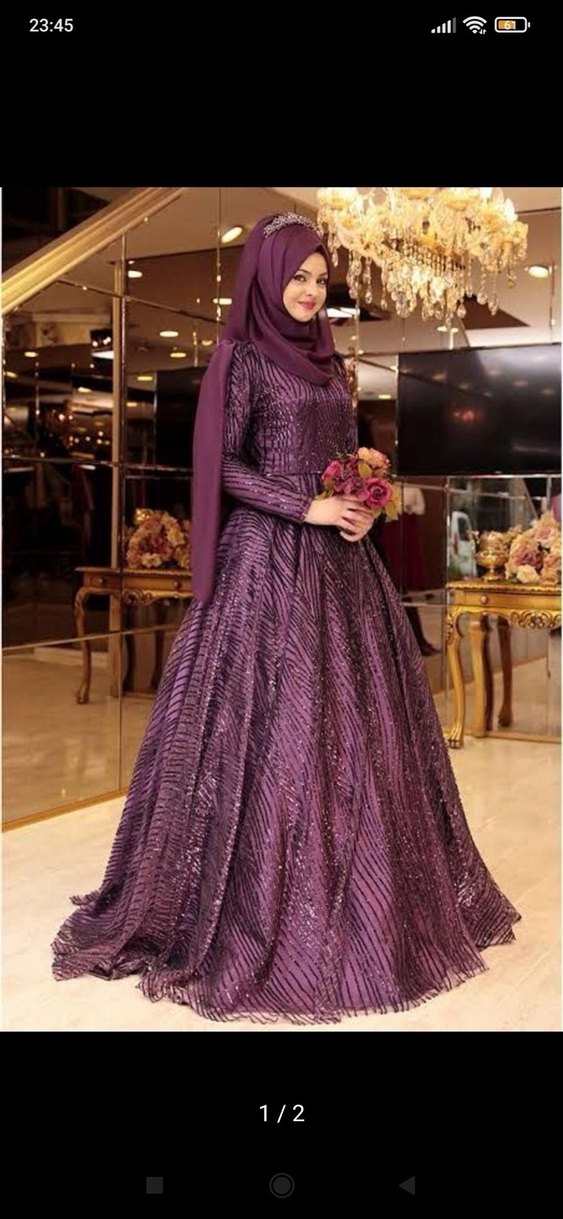 Uzun kollu, tekne yaka ve desenli mor abiye elbise. Drapeli tasarımı ve düzenli kesimi ile mütevazı ve şık bir görünüm sunar. Sadece bir kez giyildi
