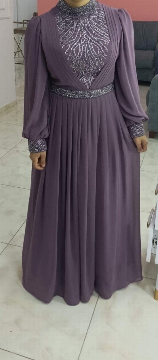 Uzun kollu, V yaka mor abiye elbise, drapeli tasarımı ve parlak beli ile düğünlere uygun, bol kesim.