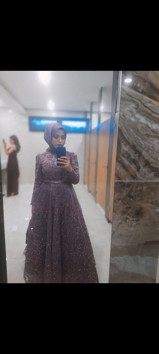Bu mor uzun kollu abiye elbise, yüksek yakalı ve drapeli tasarımıyla düğünler için şık ve gösterişli bir tercihtir. ✨