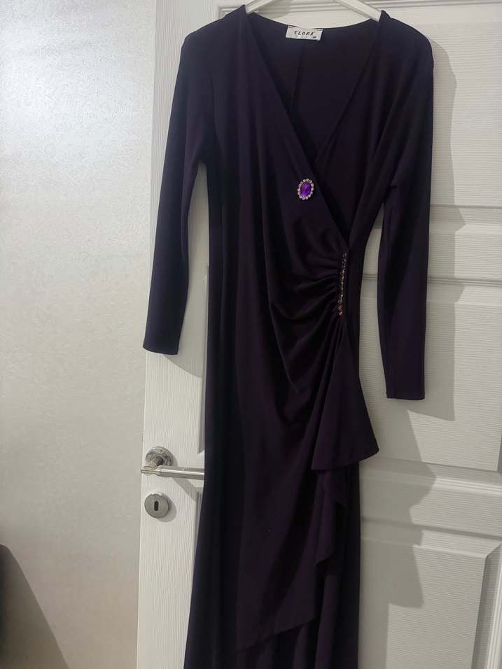 Uzun kollu ve V yaka, drapeli detaylı mor, dar kesim kadın abiye elbisedir. Ofis için uygundur.