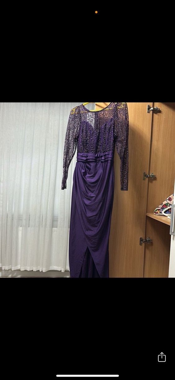 Uzun Kollu Mor Drapeli Kadın Abiye Elbise bir kere giyildi
