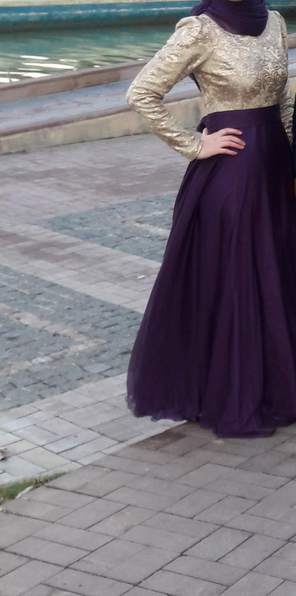 Uzun Kollu Mor Drapeli Kadın Abiye tesettür abiye