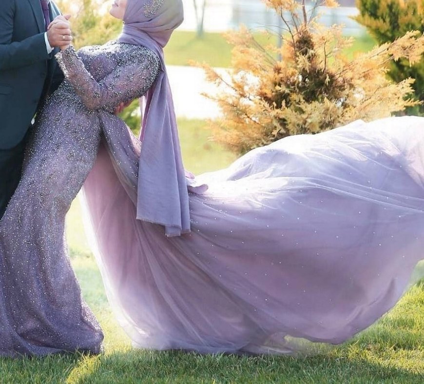 Uzun Kollu Mor Drapeli Nişan Elbisesi