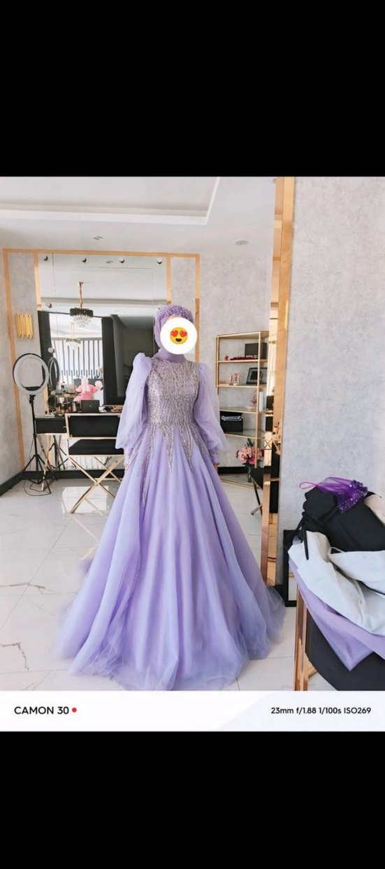 Drapeli, uzun kollu ve yüksek yakalı bu mor abiye, tesettürlü ve şık bir goth tarzını yansıtıyor.