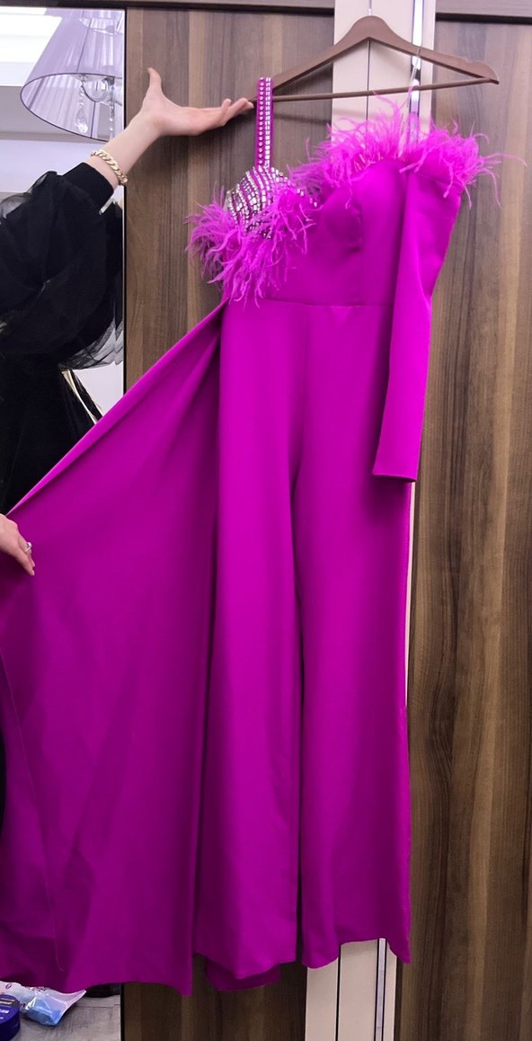 Uzun kollu, straplez yaka ve drapeli tasarıma sahip mor tulum. Sentetik kumaştan, rahat kesimle üretilmiştir. Parti için uygundur. S-m bedene uyumludur 1.75 boy 1 kez giyildi