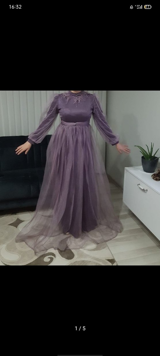 Bu mor pastel renkli, uzun kollu, yuvarlak yakalı ve drapeli tasarıma sahip dar kesim uzun abiye elbise, klasik gotik şıklığı yansıtıyor. Düğünler için uygun.