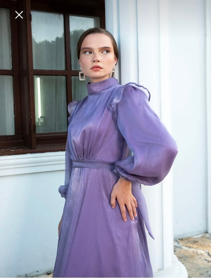 Birgül Bektaş marka abiye 38beden belinden kuşaklı abiye elbise uzun mor abiye elbise yüksek yakalı ve uzun kolludur, drapeli tasarıma sahiptir. Düzenli kesim ve pastel tonlarda batik desen içerir, modern klasik ve göz alıcı bir stildir. Bir kere kullanıldı hiçbir kusuru yok