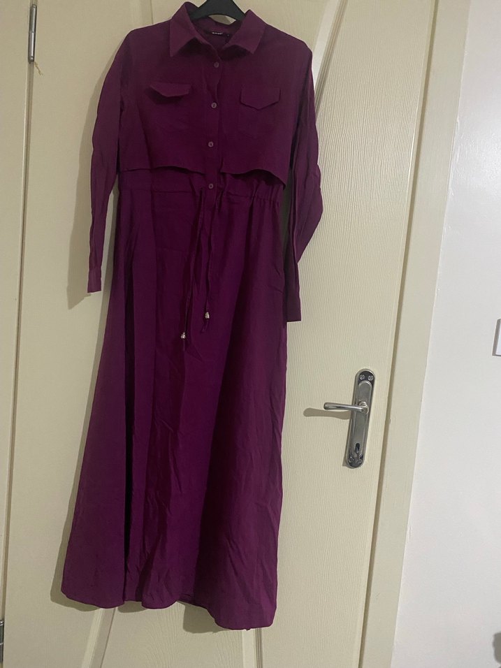 Uzun Kollu Mor Düğmeli Elbise