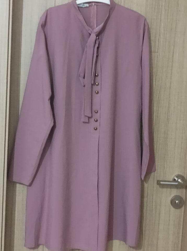 Uzun boy, düğmeli ve bol kesim mor renkte kadın tunik. İpek gibi kumaştan, uzun kollu ve yakası çıtçıtlıdır. Minimalist ve normcore tarz için uygundur.