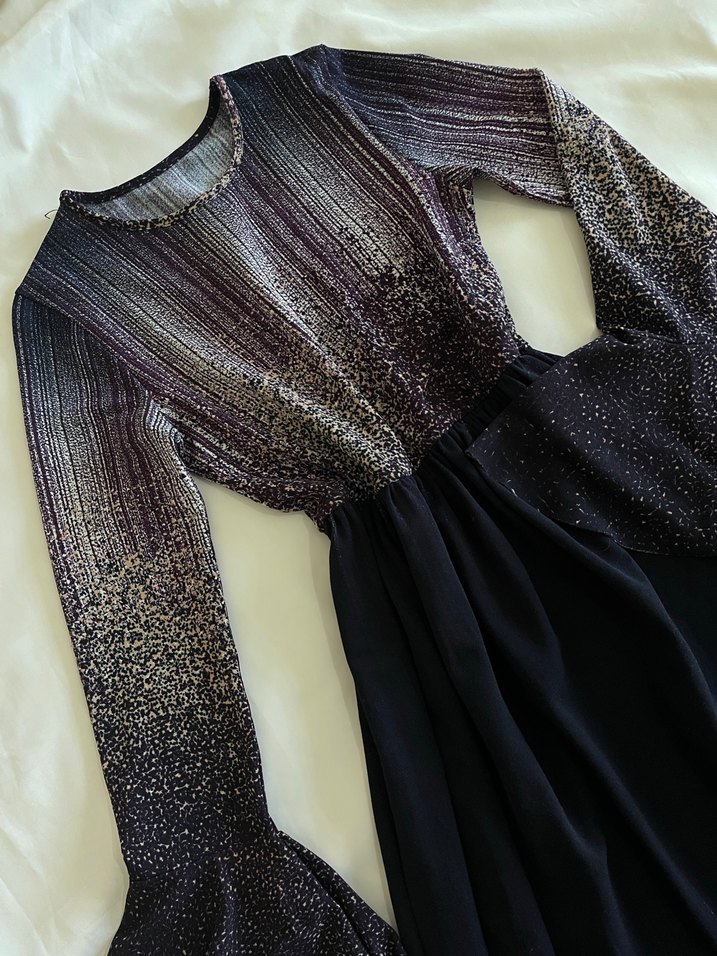Sentetik kumaştan, uzun kollu, yüksek yakalı ve kol detaylı mor desenli elbise, hiçbir defosu yok.