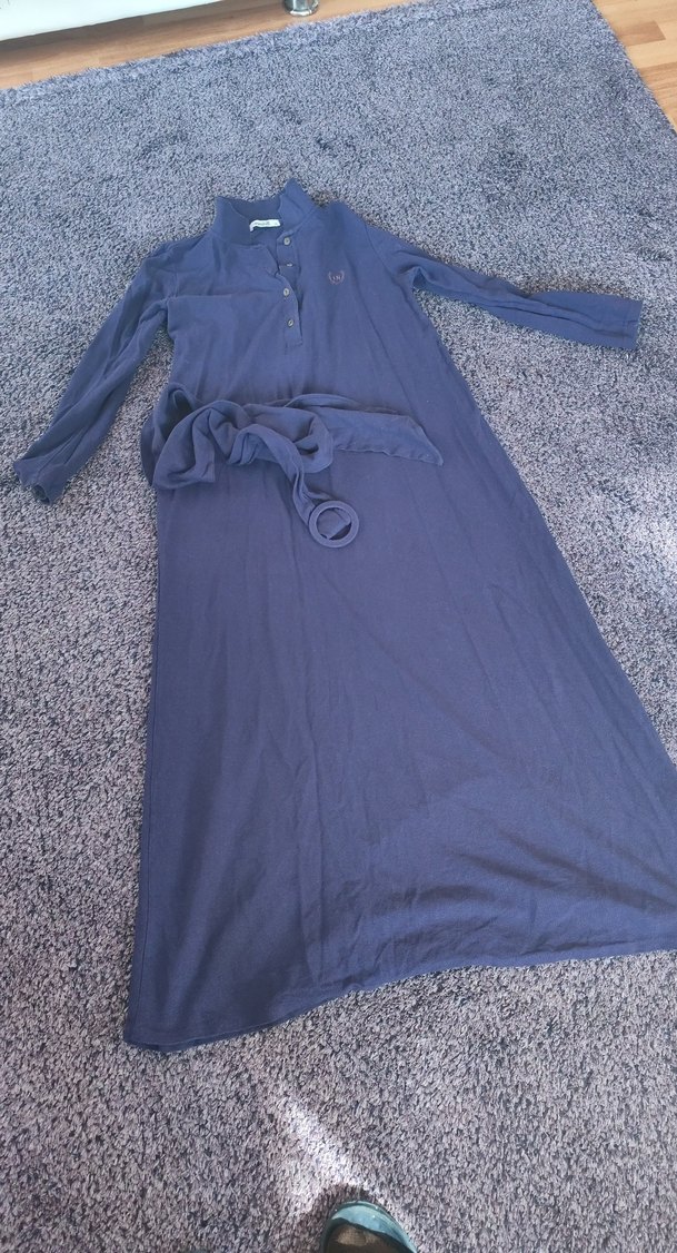 Uzun kollu, bol kesim ve mor renkte bohem tarzda kadın elbise Rahatlık için kemerle tamamlanmıştır.