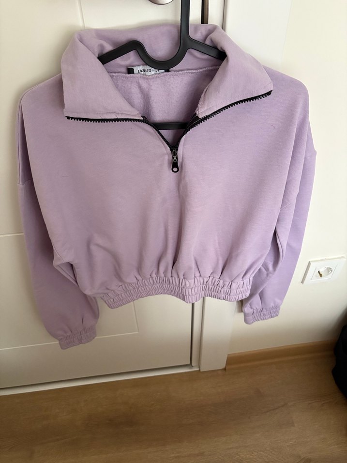 Pastel mor renkte, fermuarlı yüksek yakalı uzun kollu sweatshirt. Rahat kalıp ve esnek bel bandıyla yumuşak, sıcak kumaştan üretilmiştir.