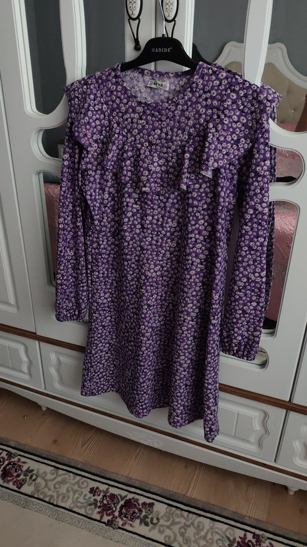Uzun Kollu Mor Fırfırlı Kız Elbisesi