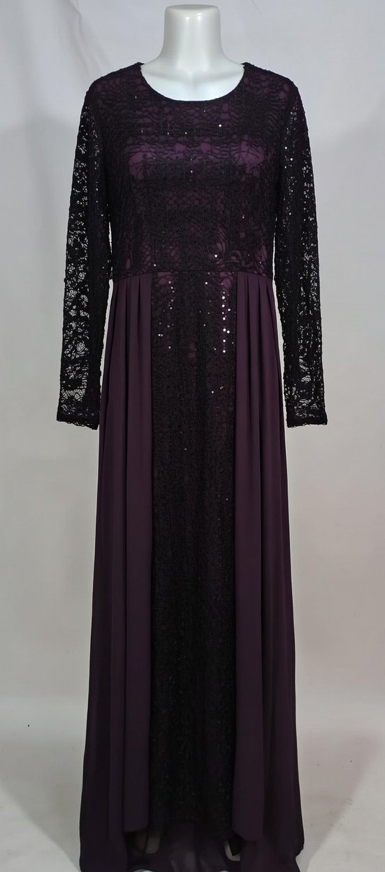 Bu koyu mor uzun abiye elbise, uzun dantel kollu ve kayık yaka detaylarına sahip, bol kesimdir. Desenli ve drapeli detaylarla gotik tarzda düğünler için uygundur.